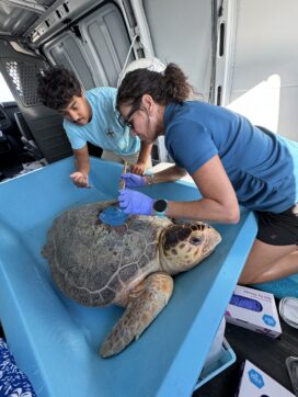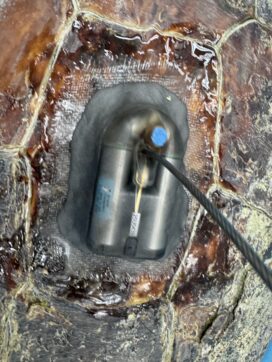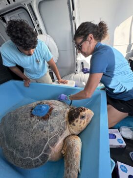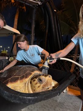 - 9/3/2025 Today Molly had some exams with Dr. Terry and as usual was her excited feisty self she had her stiches removed from her front left flipper where her past ginormous tumor has been removed from surgery, Her PVC levels have been increasing! She also received an oral exam and some wound care on her carapace (shell) to disinfect areas where barnacles have been removed- This step is crucial, as barnacle removal can leave behind raw or irritated patches that are vulnerable to infection if not properly treated so we disinfect to keep bacteria away and our turtles shells healthy- and Molly was estimated to be 25-30 years old!