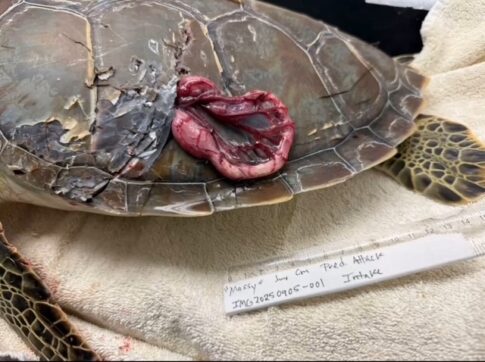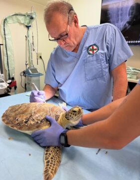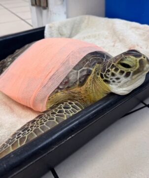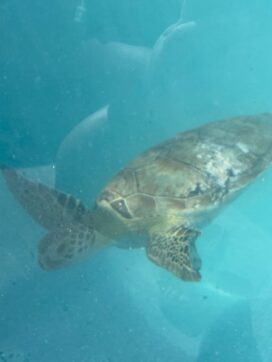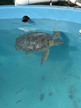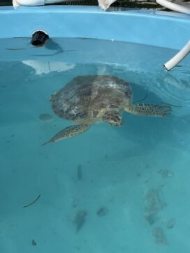 - 9/5/2025- Meet Mossy! a juvenile green sea turtle that was recused when a resident paddle boarding spotted him with a severe predator attack. Sadly, a small part of his intestines was on the outside of his body, but with the help our amazing medical staff were able to gently push the intestines back inside his body. After stabilizing Mossy’s wound with an orthopedic plate to keep the wound closed he received and exam and was taken to a rehabilitation tank for some needed rest.