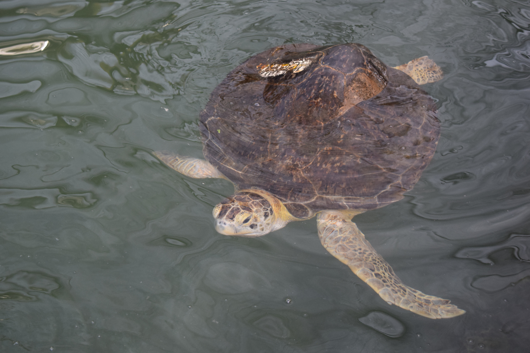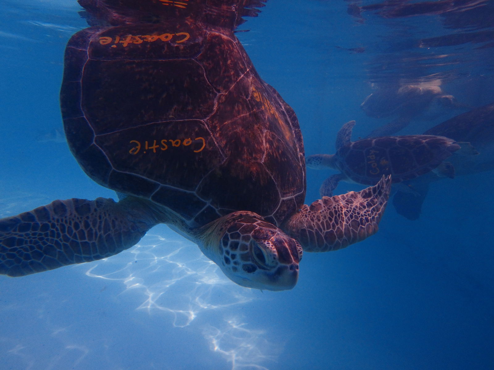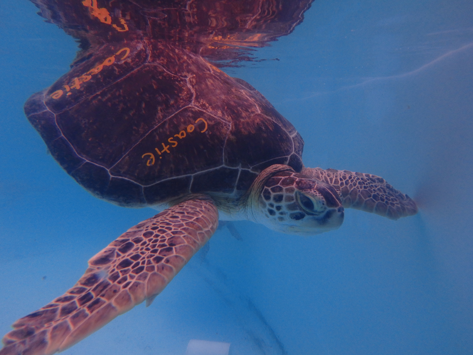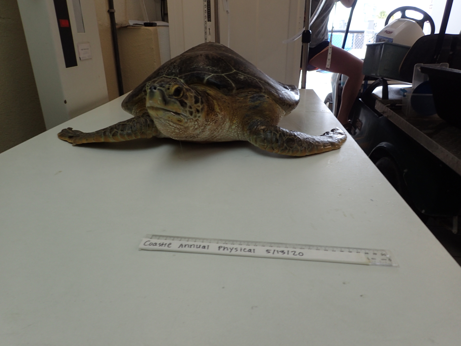 BIO: Coastie was rescued by the Fort Pierce Coast Guard in St. Lucie County, Florida on November 2, 1999. Coastie was struck across the head by the propeller of a boat, is missing the posterior end of the carapace, and is a permanent floater. Coastie also arrived at the hospital with a minor case of Fibropapilloma. Coastie has a lead weight fiberglassed to the shell in order to make life here at the hospital as comfortable as possible.