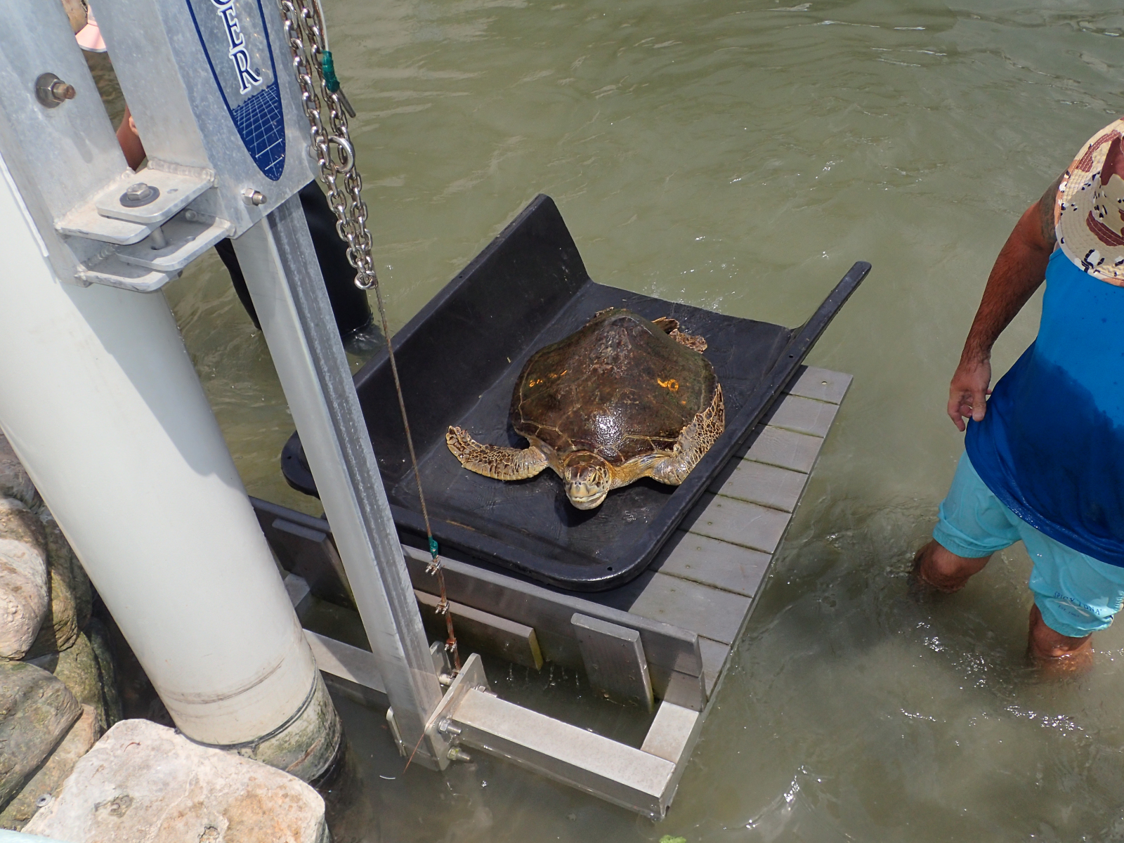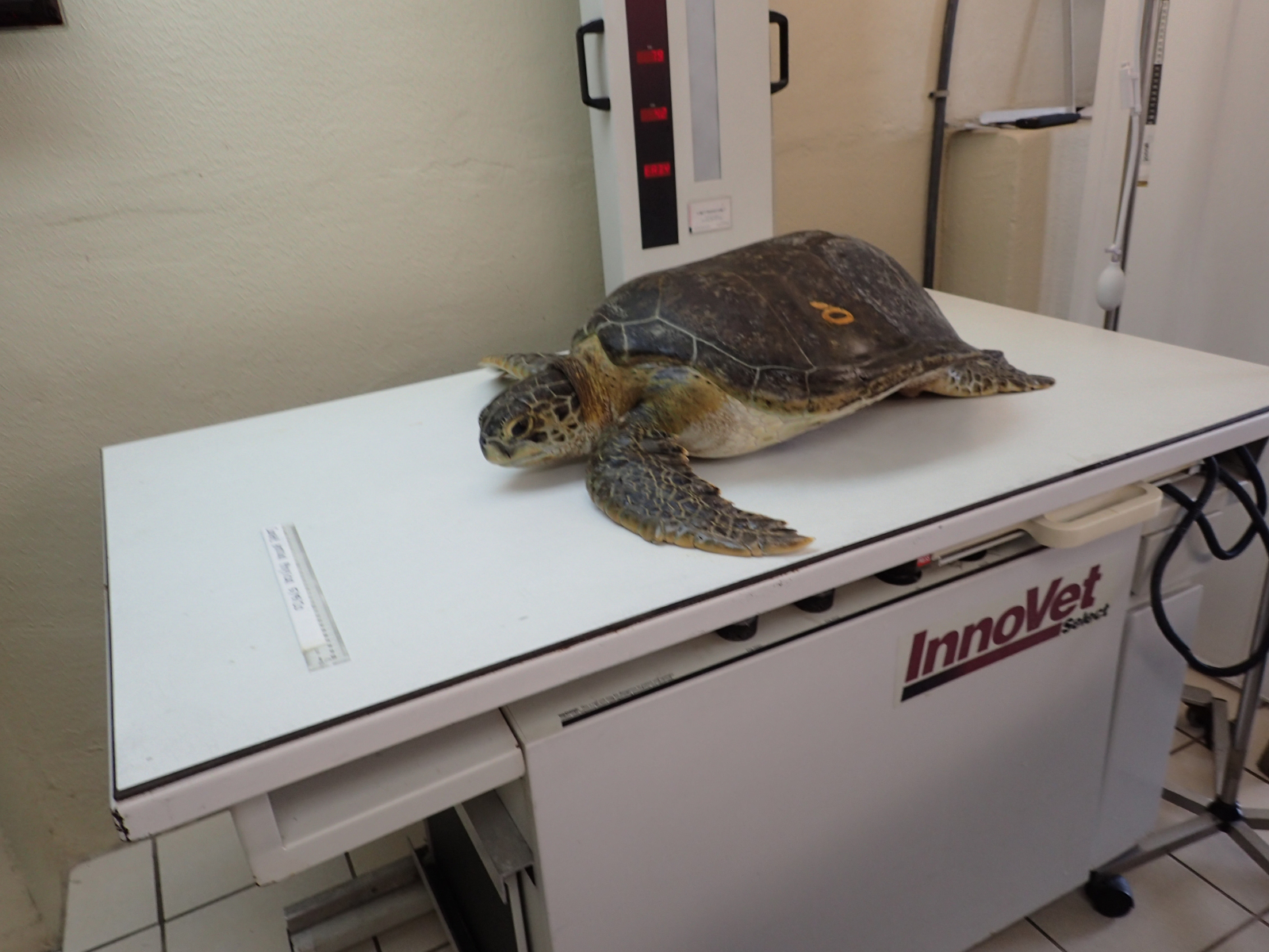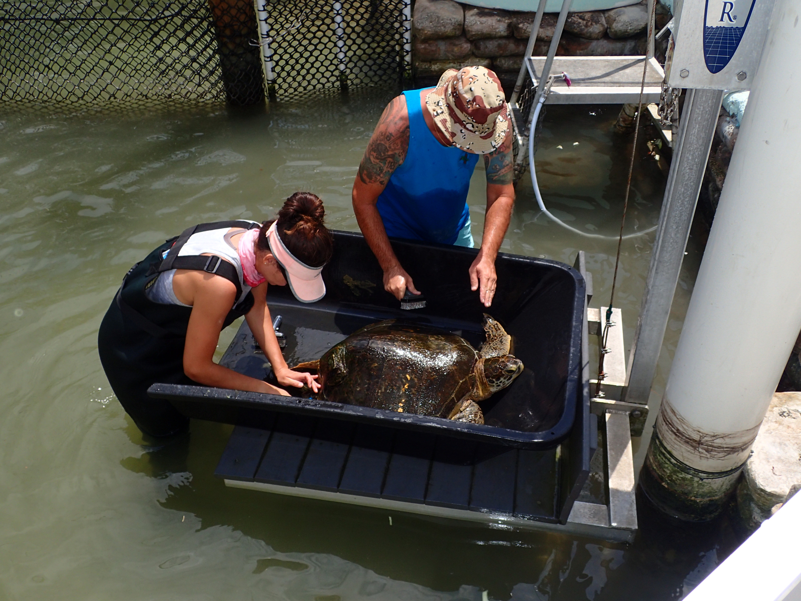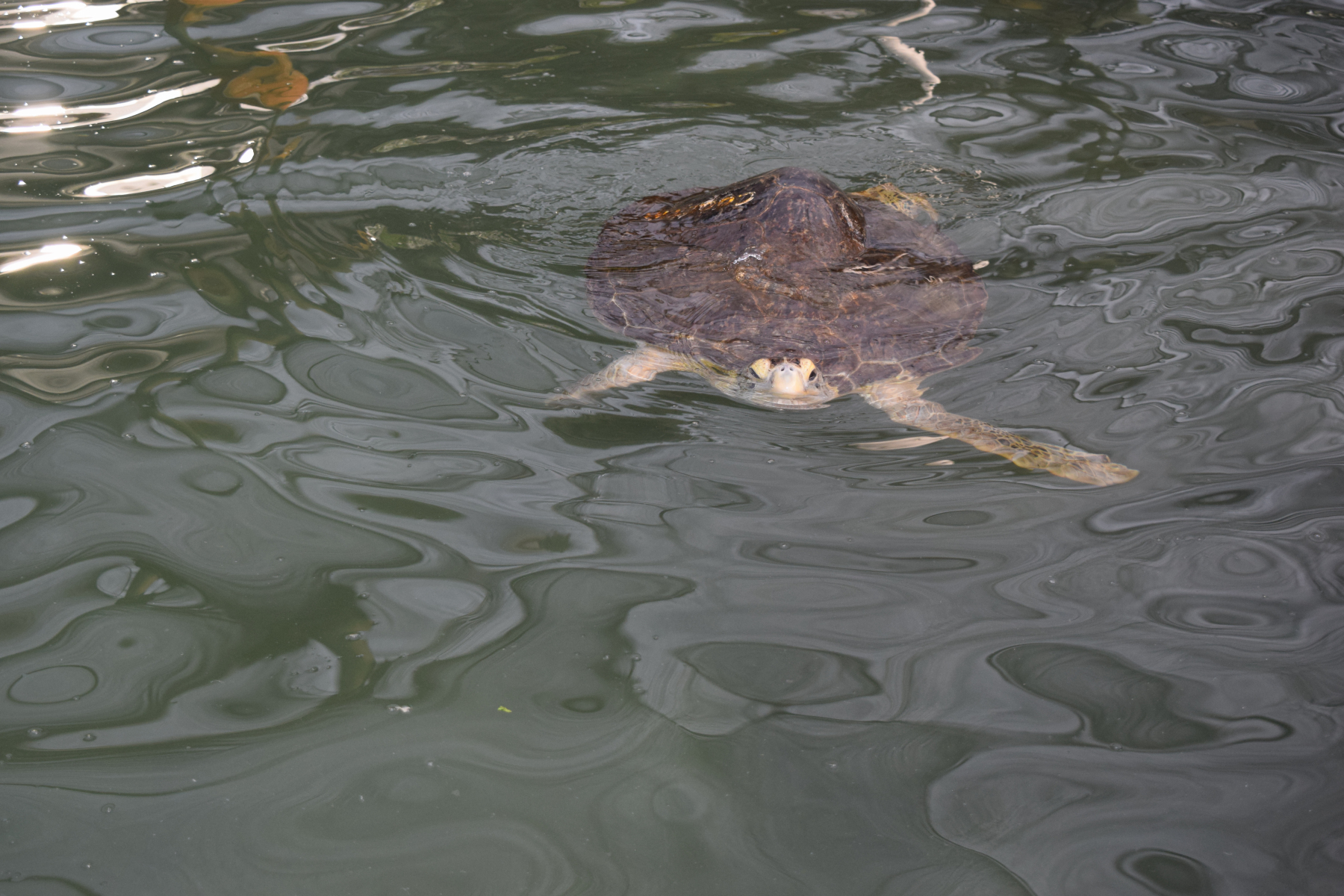 BIO: Coastie was rescued by the Fort Pierce Coast Guard in St. Lucie County, Florida on November 2, 1999. Coastie was struck across the head by the propeller of a boat, is missing the posterior end of the carapace, and is a permanent floater. Coastie also arrived at the hospital with a minor case of Fibropapilloma. Coastie has a lead weight fiberglassed to the shell in order to make life here at the hospital as comfortable as possible.
